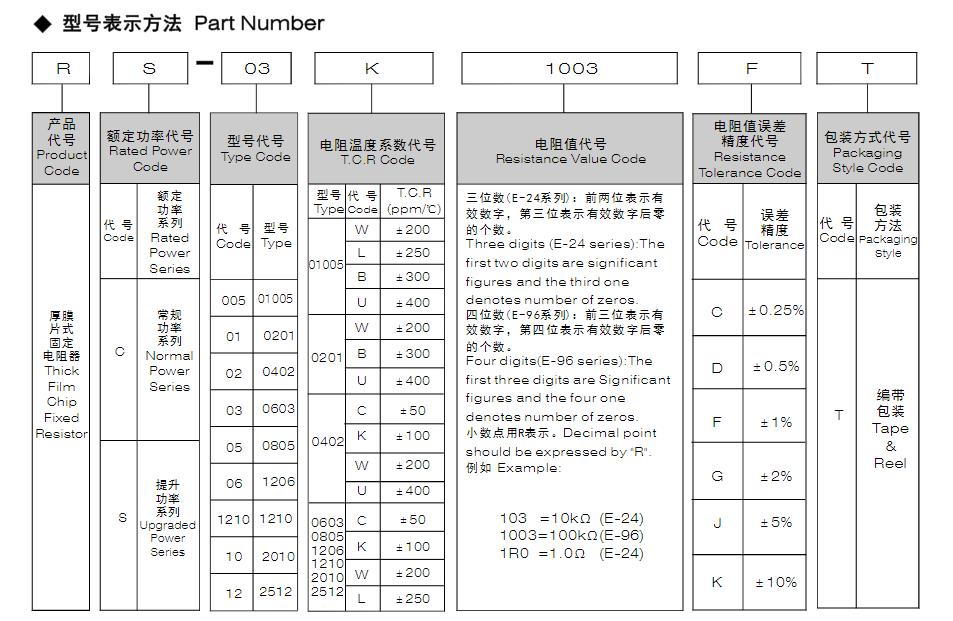 風華常規(guī)厚膜片式固定電阻器型號表示方法: