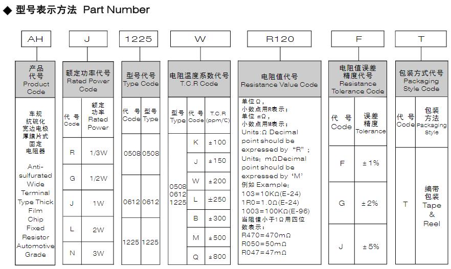 風華高科車規抗硫化寬邊電極厚膜片式固定電阻器型號命名規則: