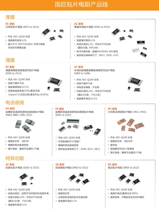 國(guó)巨是全球最大的貼片電阻供應(yīng)商之一,在汽車、工業(yè)、替代能源和消費(fèi)電子等主要市場(chǎng)鄰域提供各種應(yīng)用。國(guó)巨提供完整貼片電阻產(chǎn)品系列,涵蓋汽車級(jí)金屬電流測(cè)電阻、精密薄膜電阻、厚膜防浪涌電阻、抗硫電阻、高功率電阻、高電壓電阻、排阻、小型010050075等,全方位解決方案。