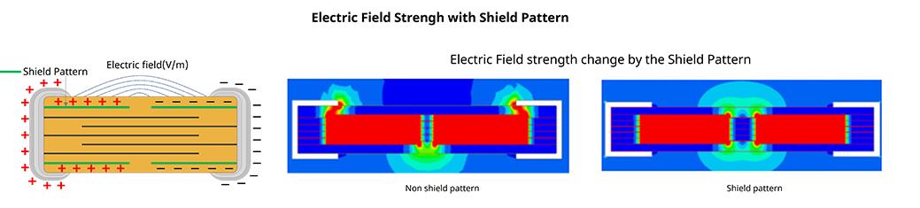 高壓MLCC結構與一般MLCC 相比有何不同呢?在高電壓環境下需要確保可靠性。暴露在高壓環境下的MLCC有Arc-ove的危險,MLCC內部存在短路的危險。當向MLCC施加高電壓時,MLCC周圍會形成強電場(Electric field),進而產生ionized air。尤其是在MLCC端電極部位集中了大的電場(Electric field)。如果在Ionized air中超過了啟動電壓(inception voltage)就會發生電 Arc,MLCC 內部就會有發生circuit short 的危險。防止這種現象產生的結構是shield pattern。