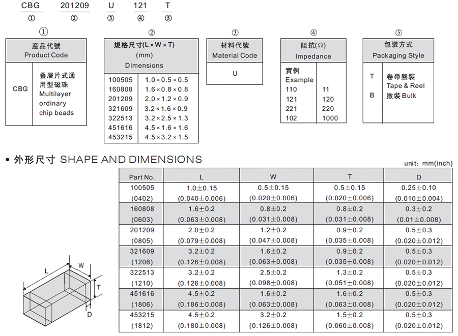 2、磁珠封裝尺寸:風華貼片磁珠的封裝尺寸共有7個,分別是:100505(0402),160808(0603),201209(0805)、321609(1206)、322513(1210),453215(1812)